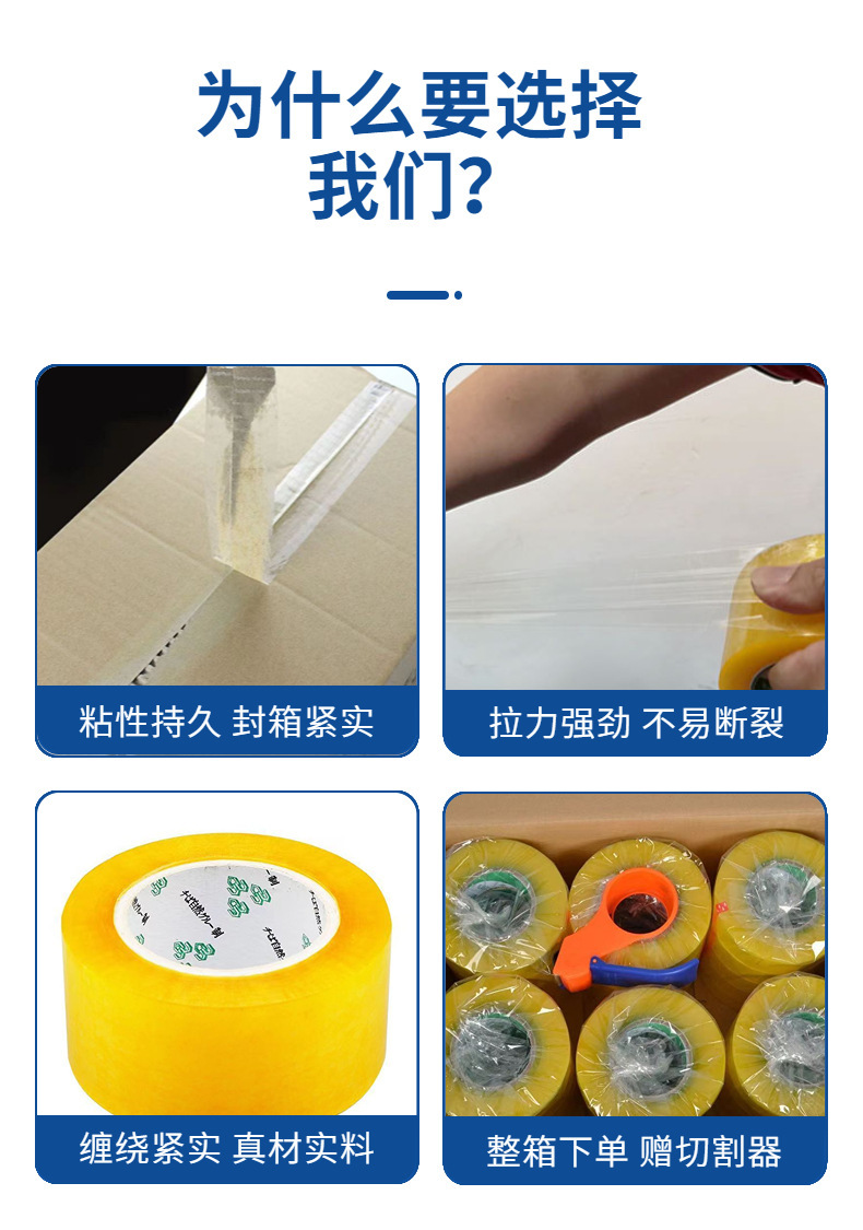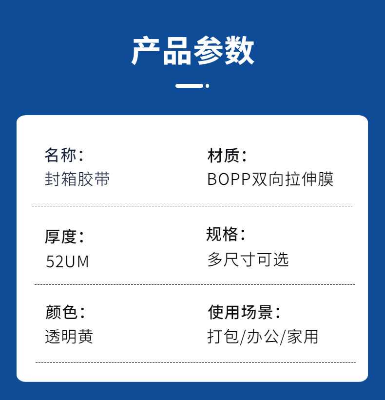 说明:BOPP胶带是以BOPP薄膜为基材,涂布以水性压敏胶,具有低成本,广泛应用的特点。